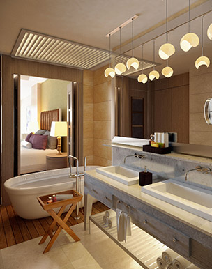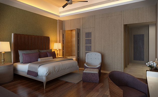 This luxurious unit features a living and dining space complete with TV, an elevated bedroom with either a king-size bed or two double beds just behind the plush living space, one and a half bathrooms with one Jacuzzi tub, a private terrace with plunge pool, and a small private balcony at the rear of the unit.